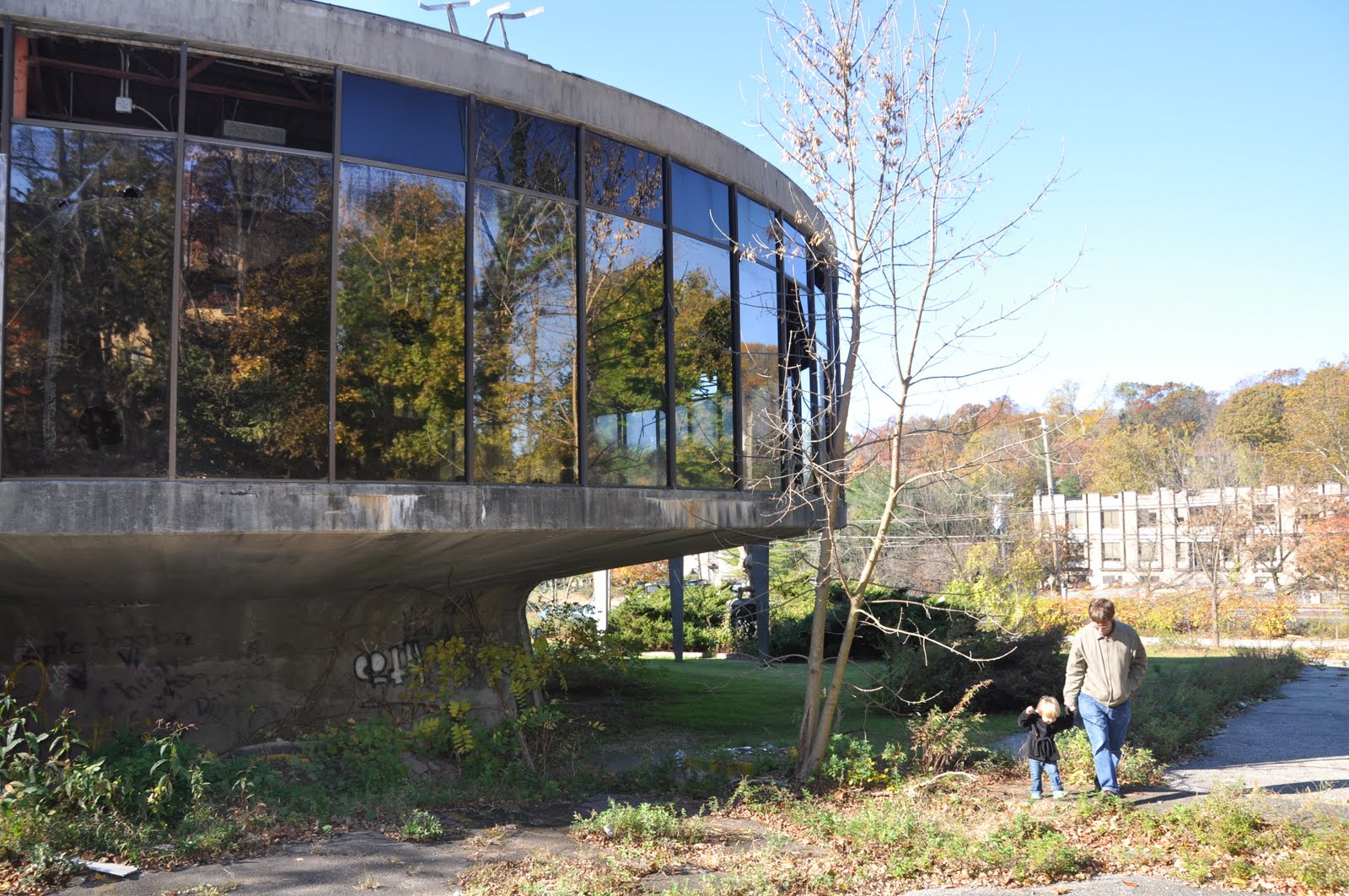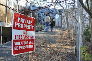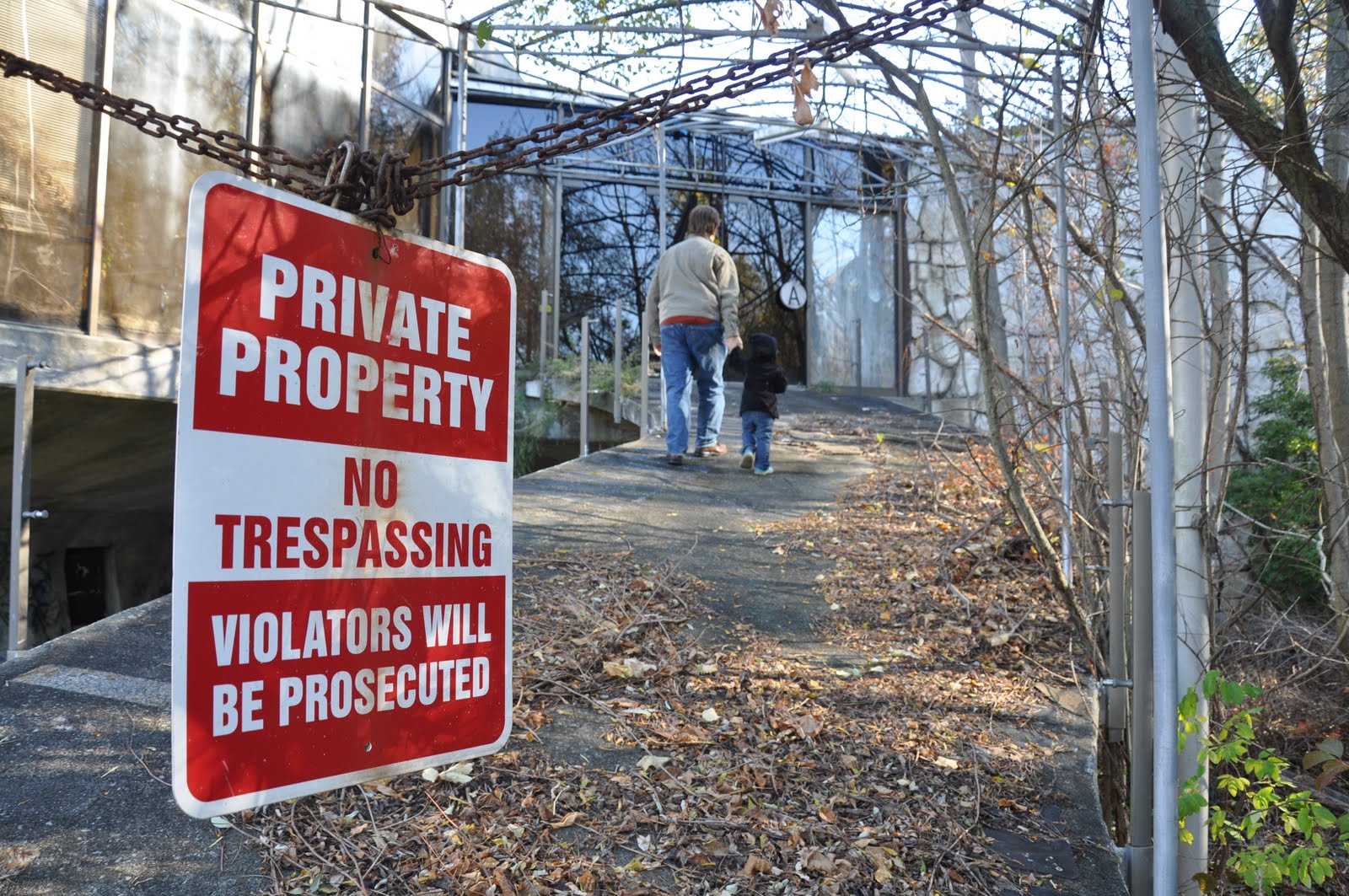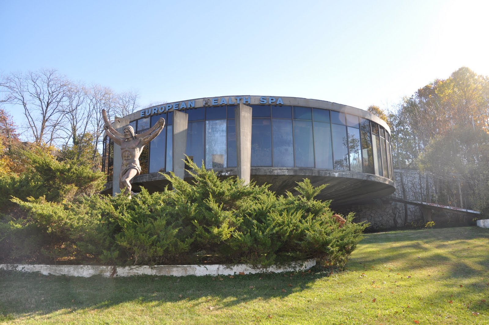 For years, we've been driving down Westchester County's Central Park Avenue, and I've told myself that one day, I'd stop and take photos of the European Health Spa in Scarsdale. Last month, that day finally came. Husband, daughter, and I had a surprisingly good time for an exploration that wasn't natural in its nature and one that we explored in a surface way. As you can see below, daughter now likes to imitate the gestures of statues, which is what really made this pit stop interesting. And, of course, getting her in a "No Trespassing" photo. It's obvious that at one point, the European Health Spa was "visionary" for its creative use of architecture on a strip mall street. But now plants have taken over in much of the inside, and upon a closer look, that fantastic statue is plastic. No wonder it hasn't been taken by vandals. I found a post about this abandoned site dated 2004. I'm curious to see how long it will be before this buiding actually gets demo'd.