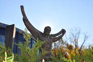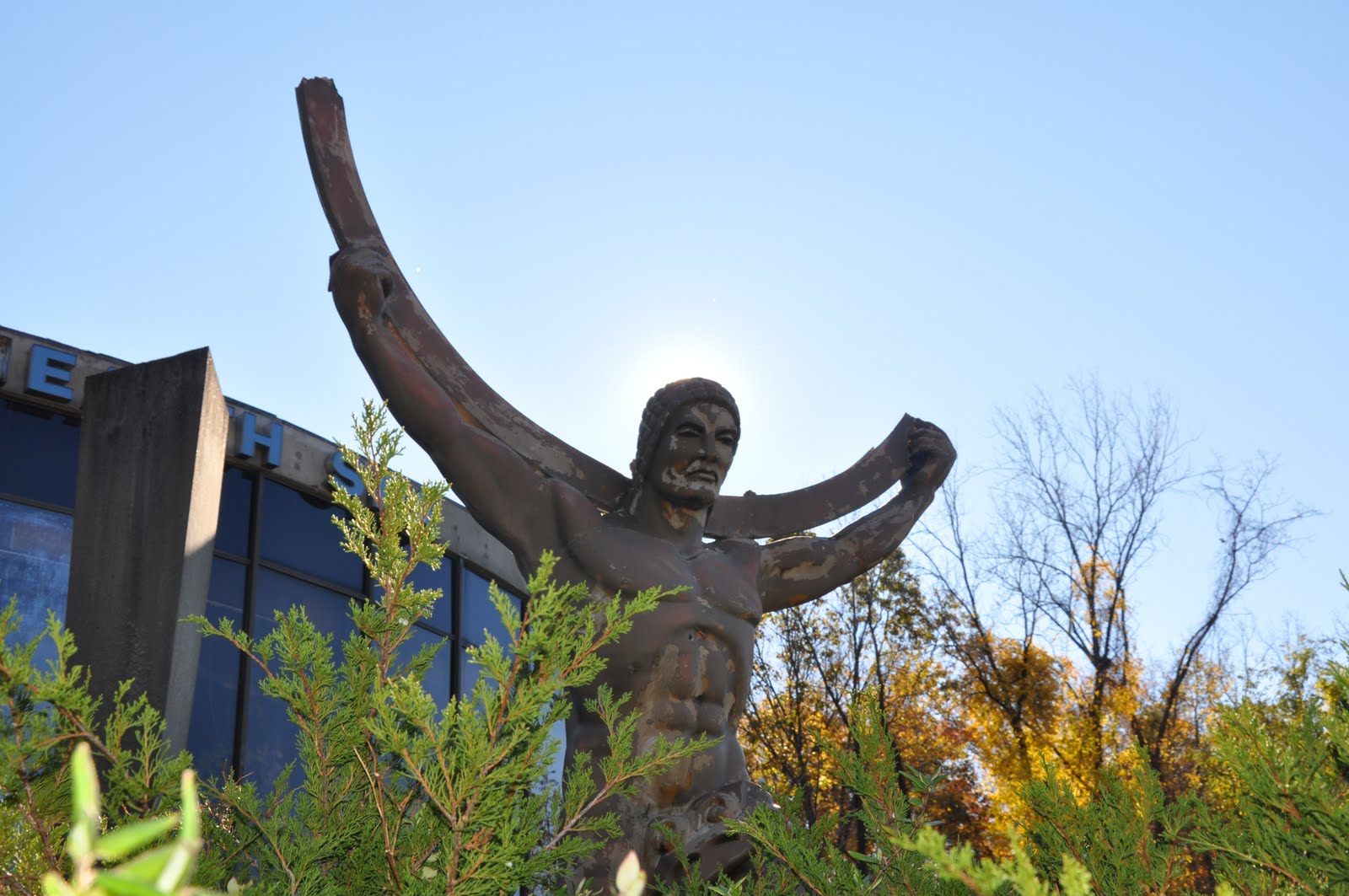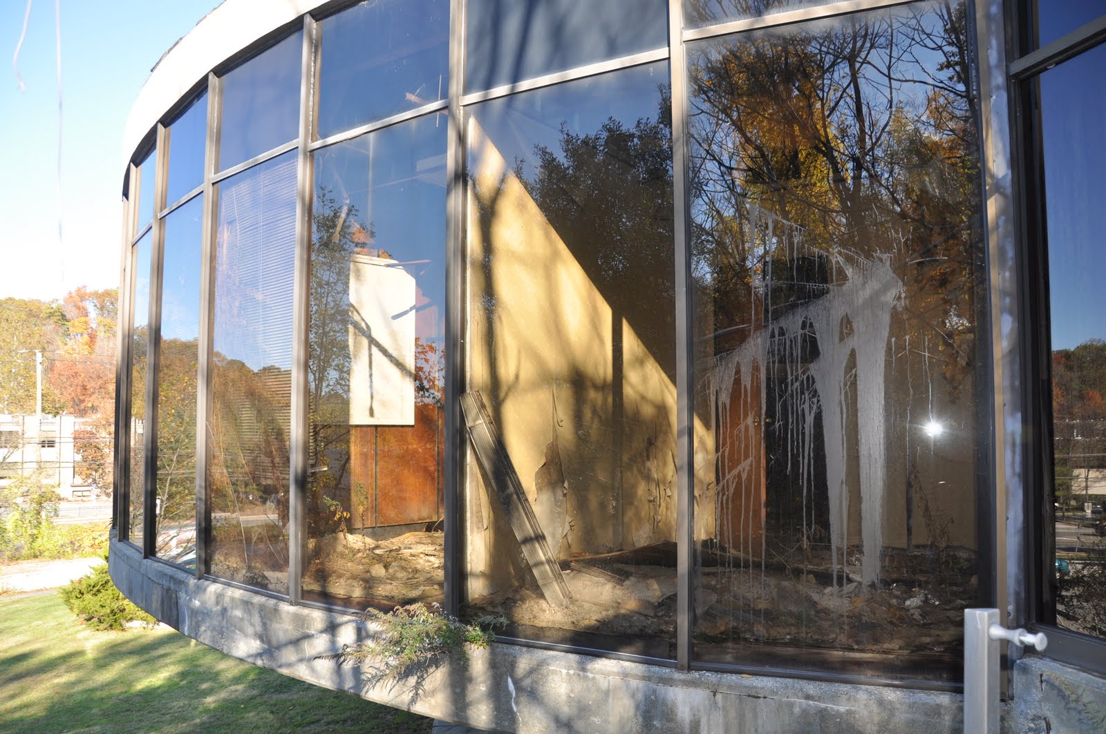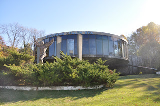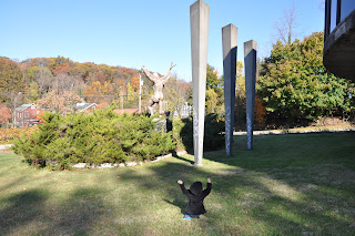 For years, we've been driving down Westchester County's Central Park Avenue, and I've told myself that one day, I'd stop and take photos of the European Health Spa in Scarsdale. Last month, that day finally came. Husband, daughter, and I had a surprisingly good time for an exploration that wasn't natural in its nature and one that we explored in a surface way. As you can see below, daughter now likes to imitate the gestures of statues, which is what really made this pit stop interesting. And, of course, getting her in a "No Trespassing" photo. It's obvious that at one point, the European Health Spa was "visionary" for its creative use of architecture on a strip mall street. But now plants have taken over in much of the inside, and upon a closer look, that fantastic statue is plastic. No wonder it hasn't been taken by vandals. I found a post about this abandoned site dated 2004. I'm curious to see how long it will be before this buiding actually gets demo'd.